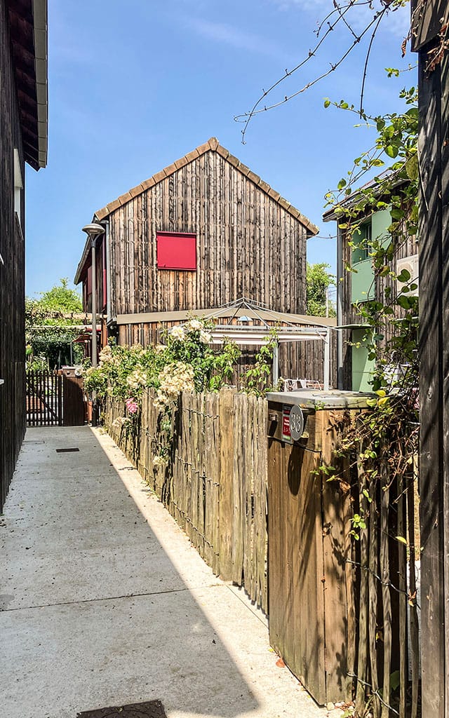 Les 40 logements d’Eysines, ville de tradition maraichère connue pour être au XIXè ‘le potager de bordeaux’, s’inscrivent dans cette dynamique, en souhaitant s’éloigner des codes du péri-urbain. Le projet va ainsi s’intégrer dans un maillage vernaculaire en lanières, en capitalisant sur la richesse des sols pour laisser la part belle aux plantations et aux espaces partagés : toute notion de régularité est abandonnée. Des espaces publics partagés sont laissés libres pour favoriser le développement d’un mode de vie participatif. Les espaces extérieurs sont séquencés et le végétal est géré pour identifier clairement le statut des espaces.