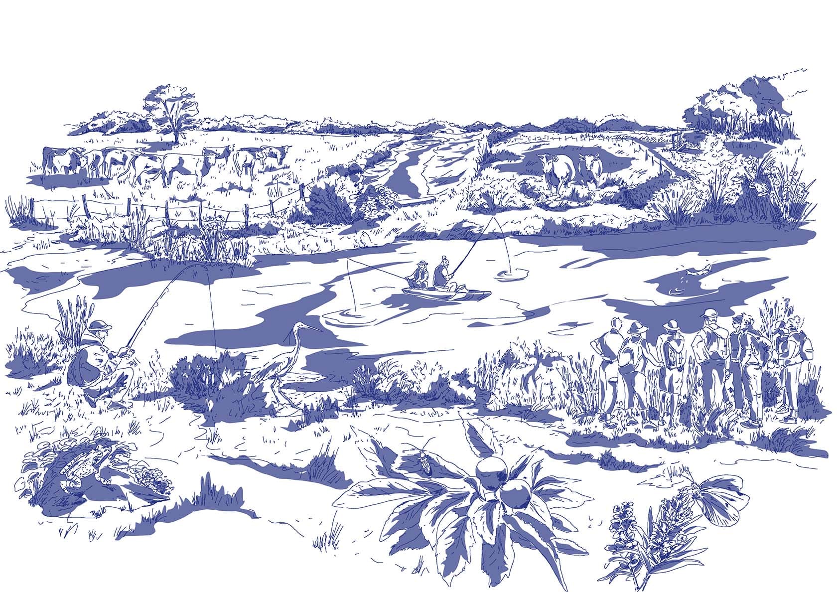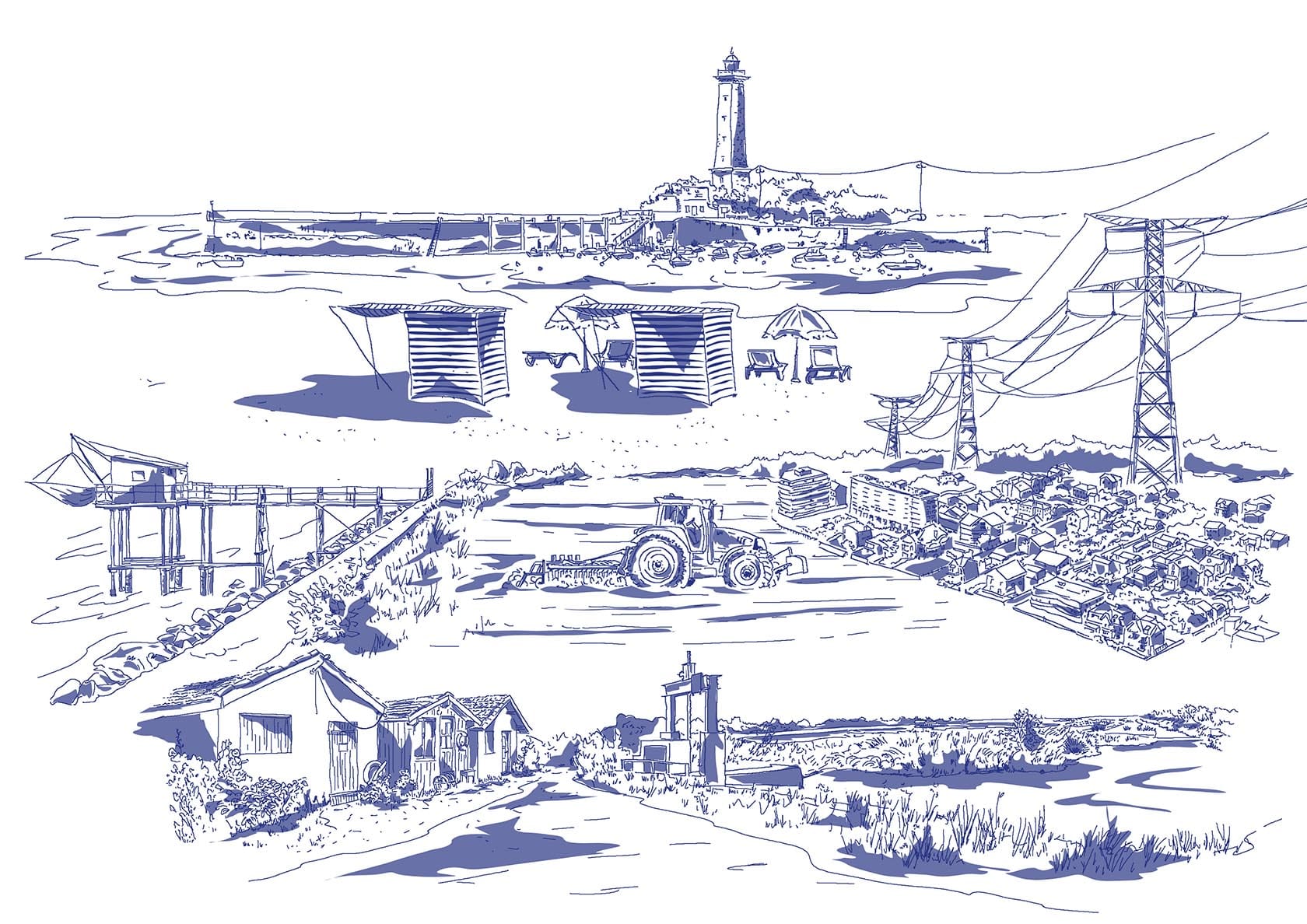 Cette étude est abordée par le prisme du dessin de paysage, de la cartographie, illustrée par un journal de bord permettant d’ancrer et de fédérer les visions territoriales et locales.